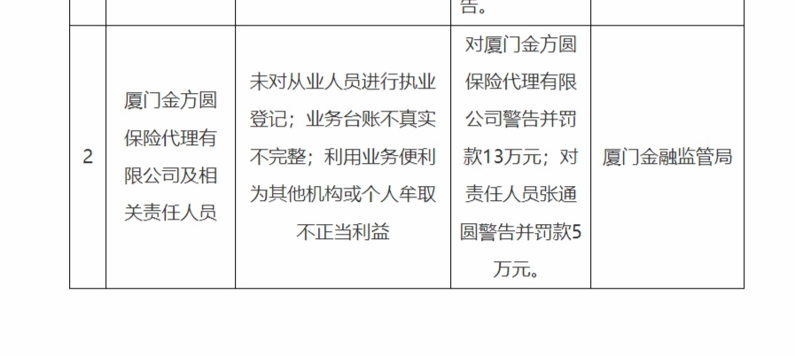 12月26日,国家金融监督管理总局厦门监管局行政处罚信息公开表(编号:2025-6)显示,厦门金方圆保险代理有限公司乐配资,未对从业人员进行执业登记;业务台账不真实不完整;利用业务便利为其他机构或个人牟取不正当利益,被警告并罚款13万元;责任人员张通圆被警告并罚款5万元。