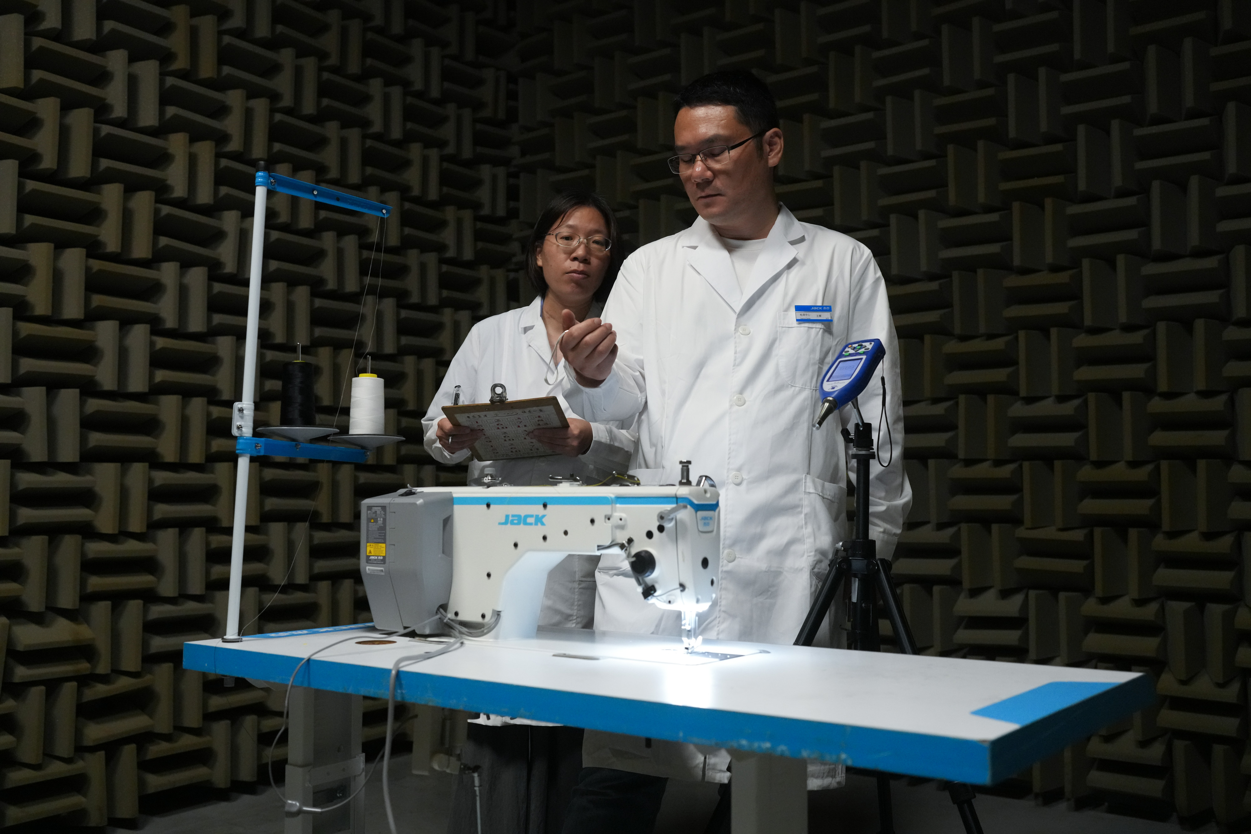 在位于台州的杰克科技股份有限公司总部,实验室工程师在半消音室检测智能缝纫机噪声(2025年7月17日摄)。位于浙江台州的杰克科技股份有限公司是一个从家用缝制设备起家的民营企业,通过不断的科技创新、专利积累、国际化并购等,成为全球智能化服装装备行业的领军者。