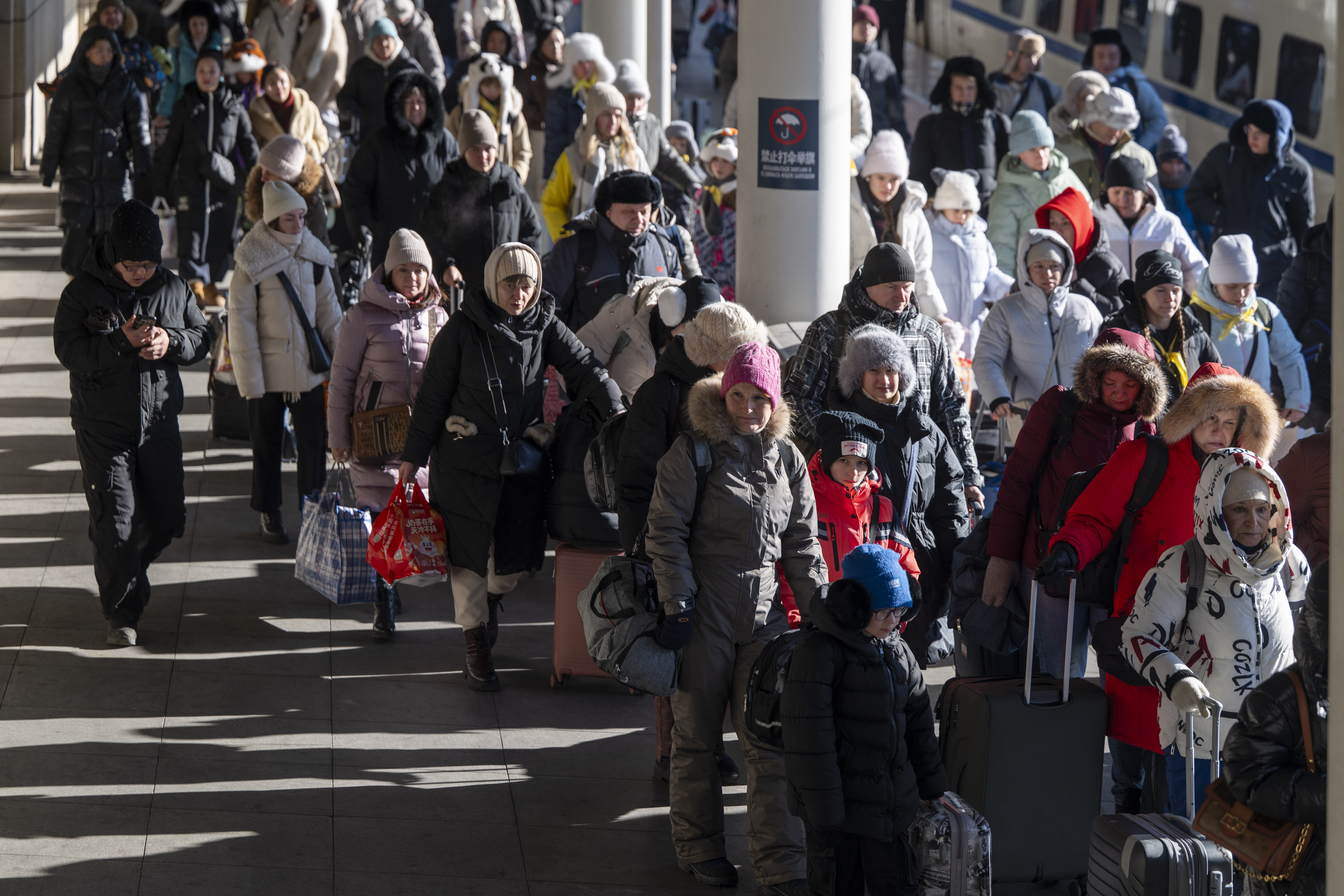 2026年1月8日,在绥芬河火车站,游客下车出站。黑龙江省绥芬河市是中俄重要陆路口岸城市。随着中俄双向免签政策实施,当地以高效便捷的通关服务提升口岸人员和贸易往来效率,带动两国人文和旅游交流。