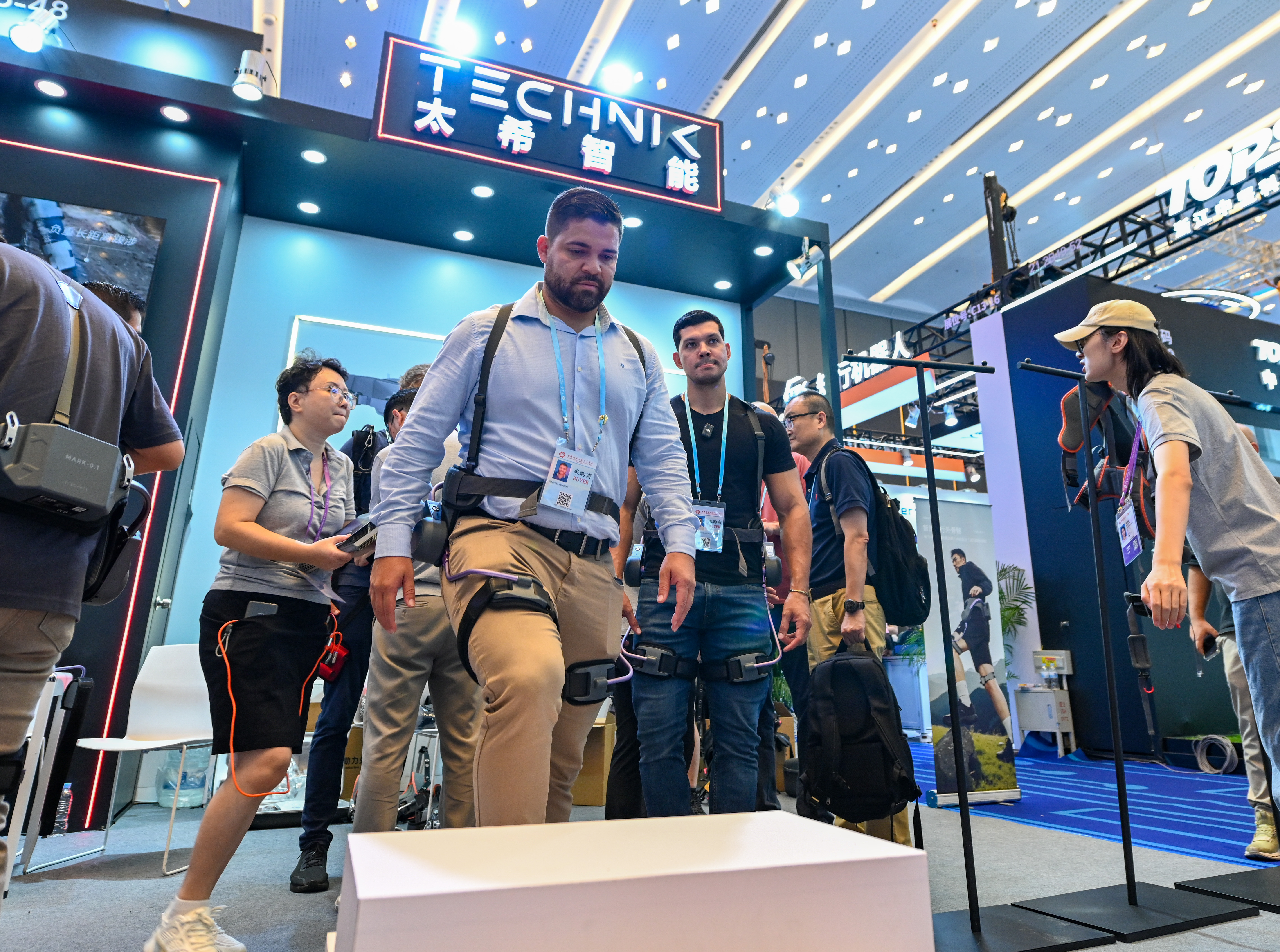 2025年10月15日,境外采购商在第138届广交会服务机器人专区太希智能展台体验登山助行外骨骼穿戴设备。